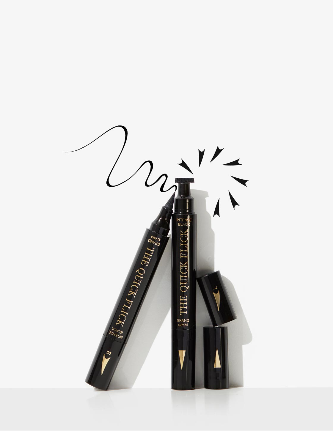 Each Quick Flick pack comes complete with two dual ended eyeliner pens. Each pen features a wing stamp (one for the left eye and one for the right) as well as two precision felt tip eyeliners to complete your look.